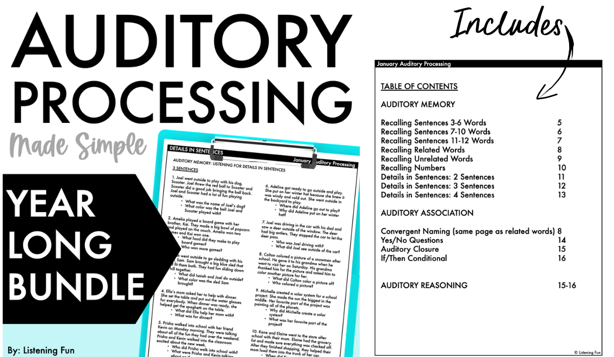 Have practice for a variety of auditory skills available all year long! The format is the same month to month, which makes progress monitoring a breeze. The topics change month to month, so there’s plenty to talk about with your student. I pair these with various games or do as a quick warm up at the beginning of a session. Save 20% with the bundle here.